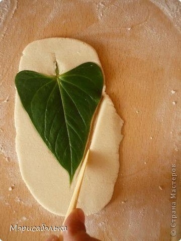 В качестве шаблона листьев я использовала лист антуриума (мне нравятся его прожилки). Но можно просто вырезать шаблон нужной формы из бумаги. Будем делать 10 таких листьев - 6 больших и 4 поменьше