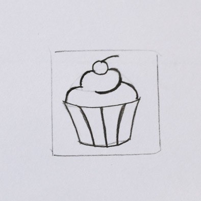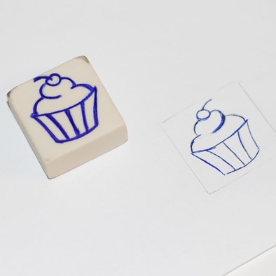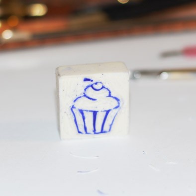 Далее берем ... как это называется? В общем палочку для заусенцев. И начинаем медленно срезать с ластика стружки. Срезаем все, кроме линий, нарисованных ручкой. Это процесс долгий и медитативный. Вырезать нужно до тех пор, пока рисунок капкейка не станет выше всей остальной поверхности на 2 - 2,5 мм. В особо труднодоступных уголках помогаем себе маникюрными ножницами.