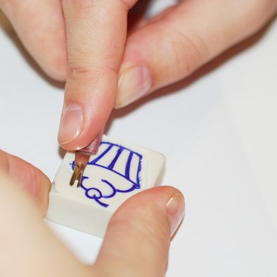 Обводим рисунок ручкой и прикладываем к нему ластик так, чтобы изображение отпечаталось на резинке. И обводим его на ластике. Нашу картинку можно было сразу нарисовать на ластике, а вот надписи лучше делать так.