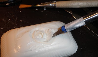 Берем резец, и вырезаем первый раскрытый лепесток розы, по внешнему краю от сделанной нами "бороздки" в мыле. Резец наклоняем в на себя, от центра цветка. После того, как вырезали лепесток, также подрезаем под ним основание, чтобы освободить лепесток.