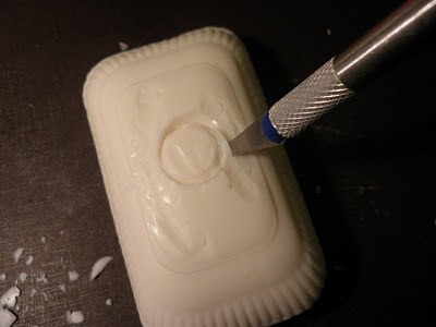 Теперь посередине мыла намечаем неглубокий круг. Это будет центр нашего будущего цветка. Наметить его можно круглым ножом-нуазеткой или обычным ножом или резцом.
