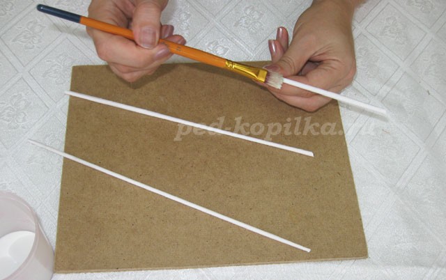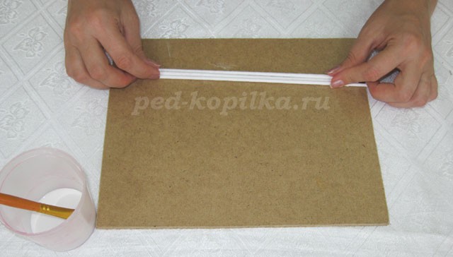 Густо покрывает заготовку из ДВП клеем ПВА.