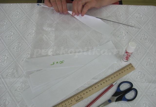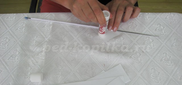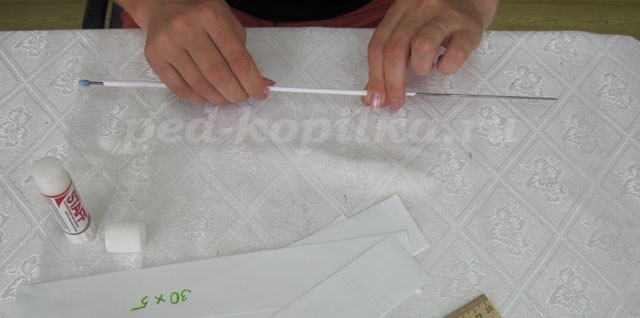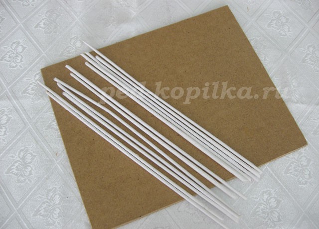 Пока наша основа подсыхает, перейдем к изготовлению рамки. Для этого берем бумажные полоски, накручиваем  за уголок на спицу «в трубочку».