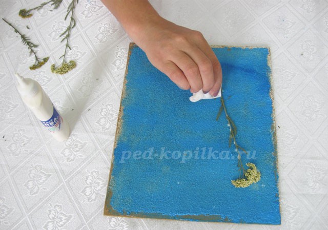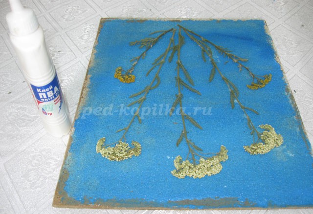 После высыхания краски, приступаем к декорированию. Приклеиваем клеем ПВА сухие веточки и цветочки, остатки клея аккуратно удаляем салфеткой.