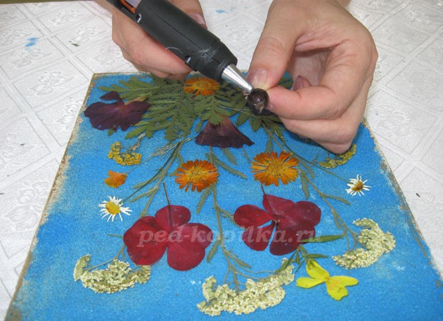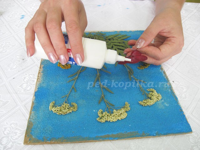 Если в работе используются семена шиповника, косточки лимона и тд., то их лучше приклеивать клеевым пистолетом.