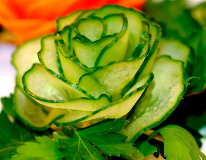 Разрежьте огурец на тонкие кружочки. Чем больше кружков, тем пышнее получится роза.