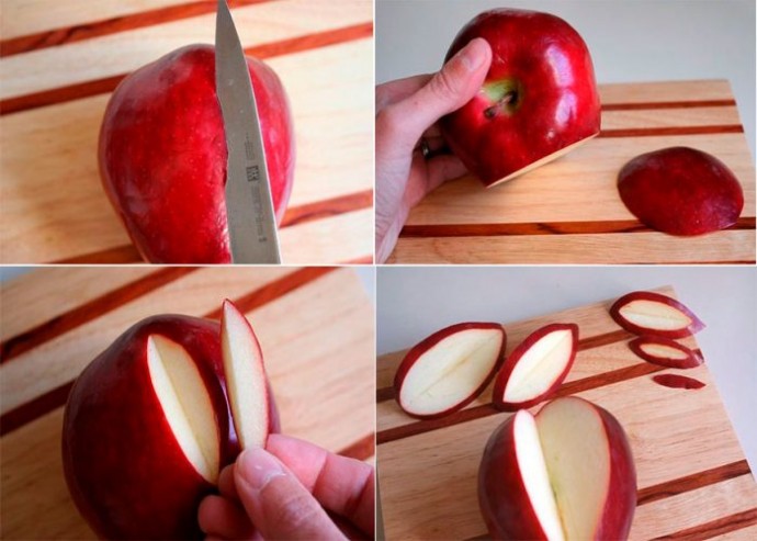 Найдите середину яблока, уйдите чуть правее и вырежьте дольку наверху.