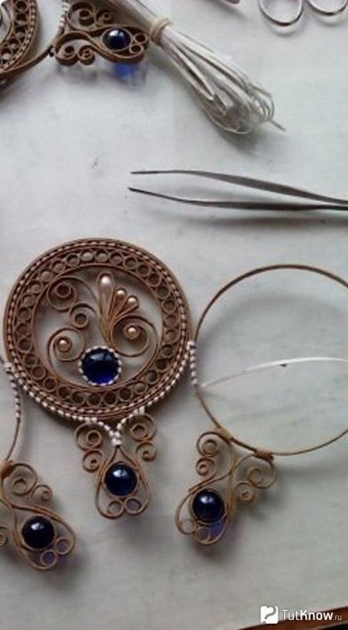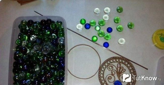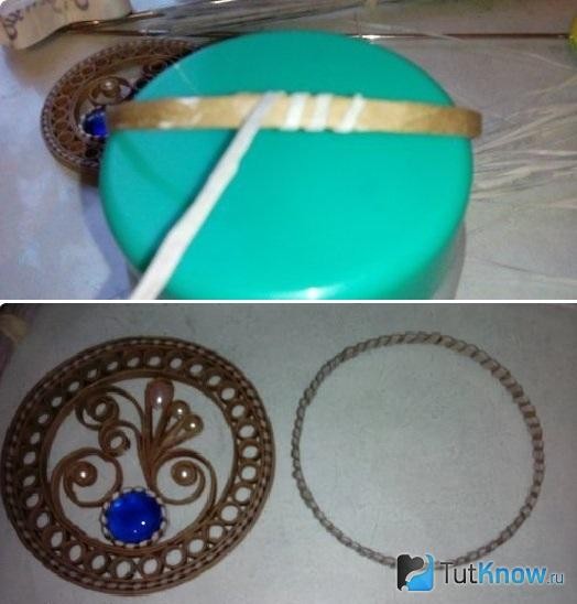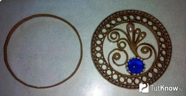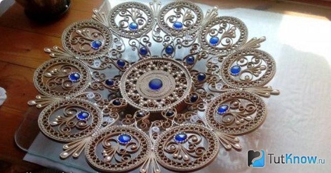 При помощи неё же вы соедините различные элементы. Таким образом вы скрепите между собой окружности, а также завитки с камушками. В большие кольца, которые станут своеобразным каркасом блюда, нужно вкладывать кольца чуть меньшего диаметра, прикреплять их при помощи завитков из кальки.