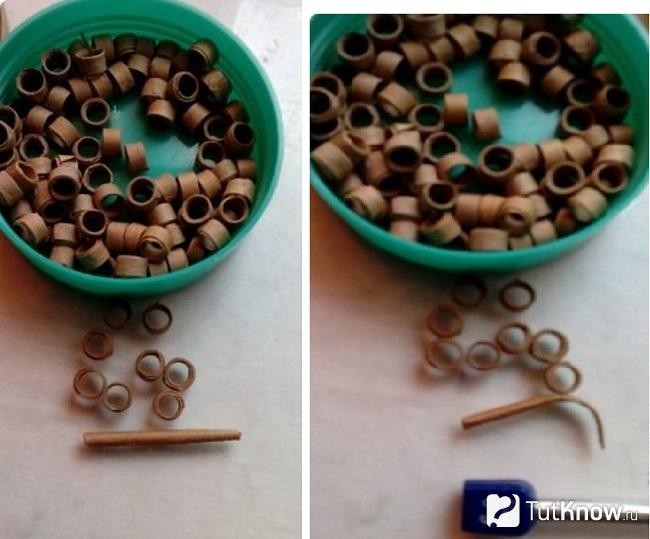 Теперь нужно сделать донышко. Его также поможет создать техника торсион папье. Нарежьте небольших прямоугольников, накрутите каждый на спицу толщиной 3 мм. Теперь заготовки нужно превратить в колечки. Для этого прокатайте их на спице толщиной 6 мм и склейте кончики.