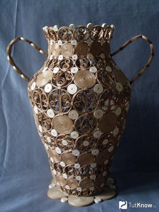 Подобную форму можно взять, если у вас есть такая вазочка или бутылка из-под вина, или кувшин. Такая работа напоминает нечто среднее между квиллингом и кручением из газет. Если вы занимались уже таким рукоделием, тогда вам будет совсем просто сделать амфору.