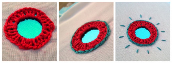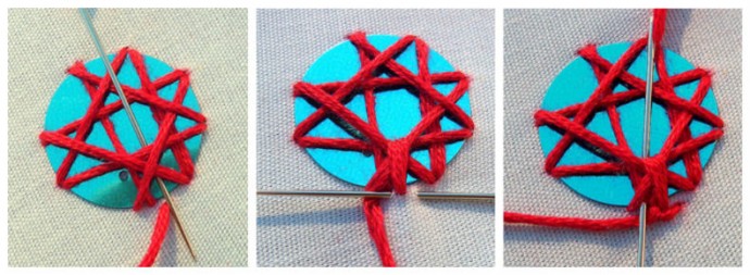 Как вариант — на зеркале первоначально выполняют не решетку, а сразу многолучевую звезду. Весь край обрамляют плотным обметочным швом «цепочка». Последнее звено выводят наизнанку и закрепляют французским узлом.
