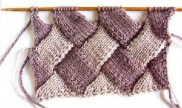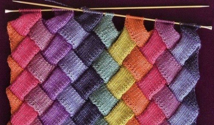 Основная особенность этого метода вязания состоит в том, что фрагменты вяжутся без отрыва нити. Если вязание состоит из двух цветов, то полосы фрагментов, повернутых примерно на 45 градусов, вяжутся поочередно со сменой цвета. Энтрелак можно использовать и в одноцветном вязании, в таком варианте очень эффектно смотрятся рельефные и даже ажурные узоры.