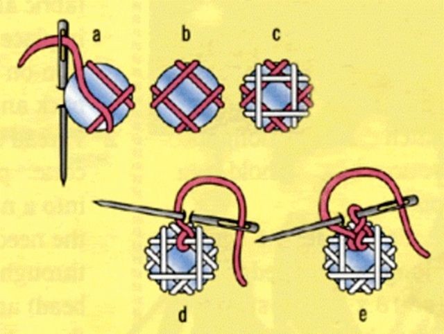 В первую очередь выполняется основа-решетка, которая держит зеркальце на месте. В процессе вышивки следите за тем, чтобы нитка была плотно натянута. Стежки, образующие решетку, должны быть параллельными (в обоих направлениях) и проходить как можно ближе к центру зеркальца. (Впоследствии, когда вокруг решетки будут выполнены остальные стежки, они оттянут ее от центра зеркальца, открыв его). Если стежки решетки будут слишком свободными или окажутся близко к краям, они не смогут удержать «шишу» на месте, она выпадет вся или вылезет какой-то из краёв.