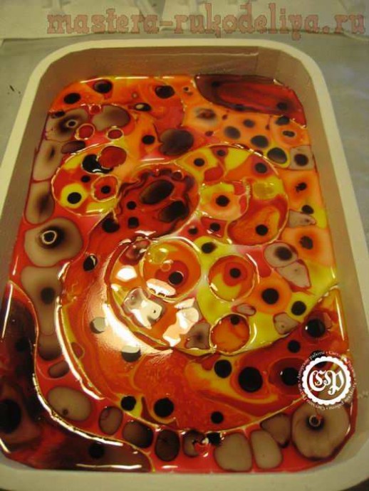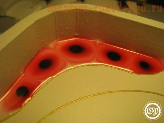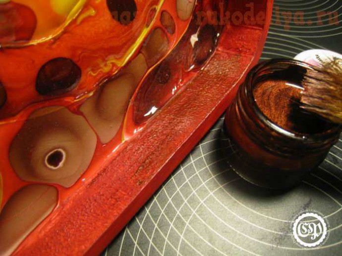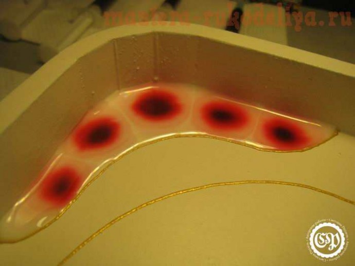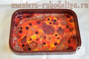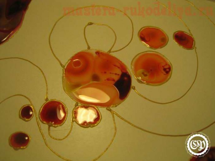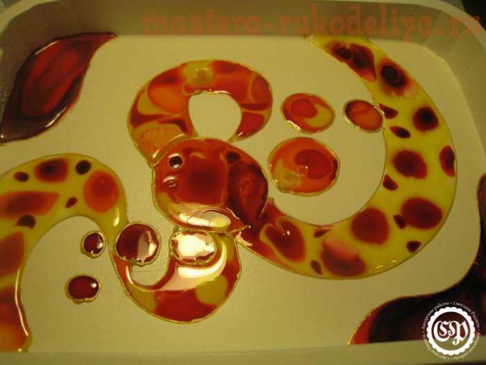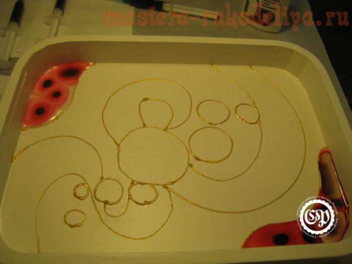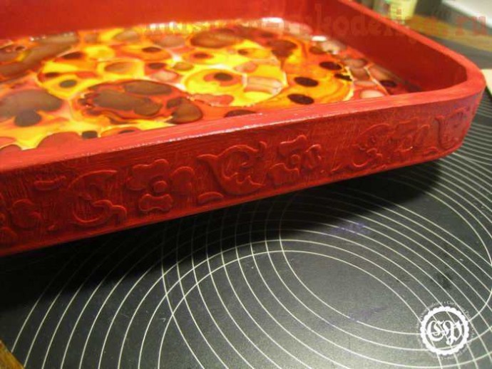 Краски я налила от души, благо поднос имеет стенки, зато сушилось это красное безумие более недели (и под феном, и под лампой). Учитесь на чужих ошибках и экономьте витражную краску.
