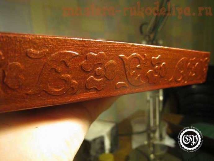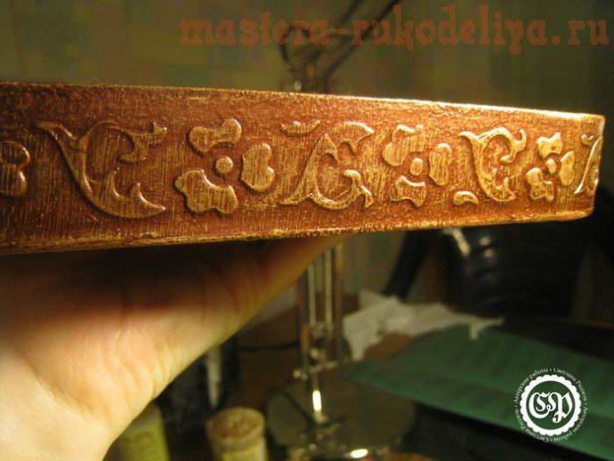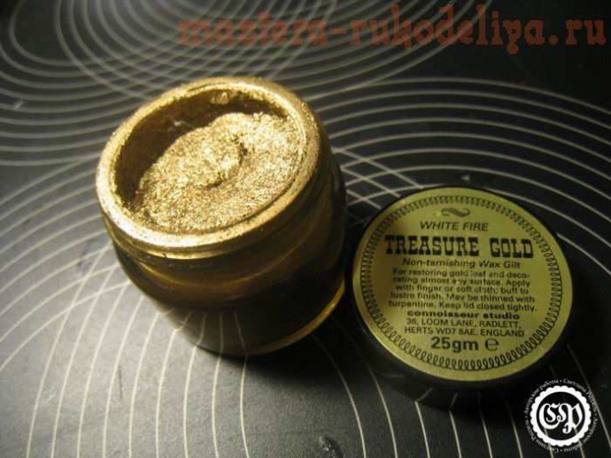 Используя воск для золочения выделяем рельеф. Это можно сделать и просто сухой кистью и золотым акрилом.