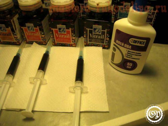 Готовим витражные краски, которые будем использовать в работе, и клей ПВА. Я взяла офисный вариант;) Краску набираем в шприцы, каждый кладем напротив своей баночки, чтобы в процессе работы понимать, какой цвет берешь. Дело в том, что в шприце все краски выглядят практически черными и различить цвет не возможно.