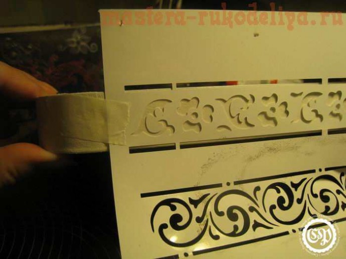 Мастихином наносим тонкий слой пасты, заполняя трафаретные отверстия. Вместо мастихина подойдет и одноразовая вилка и пластмассовый стек от детского пластилина.