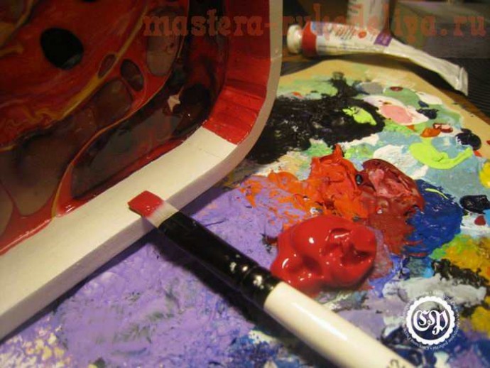 Акриловыми красками закрашиваем всю свободную от jacarelado поверхность в основной тон. У меня он красный.