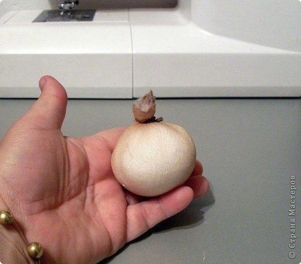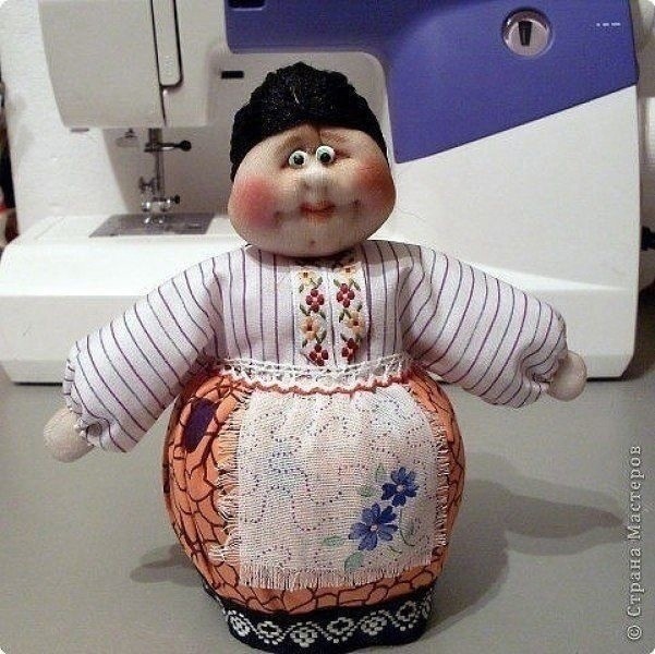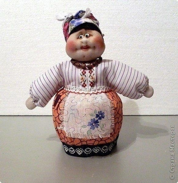Углы квадратной ткани, нужной величины, закрепляем иголочками в четырех местах, чтобы было удобно, равномерно сделать сборочку для юбочки на талии. Равномерно распределяем сборочку и прошиваем наметочным швом. Края ткани заправляем во внутрь бутылки. Булавками отмечаем боковые швы. Подбираем ткань для блузки, которая состоит из прямоугольника. Серединку по длине прямоугольника совмещаем по центру на талии , без разницы: будь то перед или спинка, и пришиваем от одного бокового шва до другого. А теперь делаем головку куколки. Из синетпона скручиваем шарик поплотнее. Обтягиваем колготочным трикотажем и затягиваем на макушке головы. Здесь я показываю самый простой способ, как сделать на личике, с помощью иголки, вытяжку носика, ротика и подбородочка. Сначала вытягиваем носик. Делать надо острожно, чтобы не поломать иглу и не порвать ткань. Чтобы носик был слегка курносеньким, утяните его ниткой на затылочек. Рисуем фломастером губки, наносим косметикой румяна, пришиваем или приклеиваем (в моем варианте) глазки. Для паричка берем два пучка пряжи. Пришиваем или приклеиваем первый пучок. Автор мастер-класса: Ликма