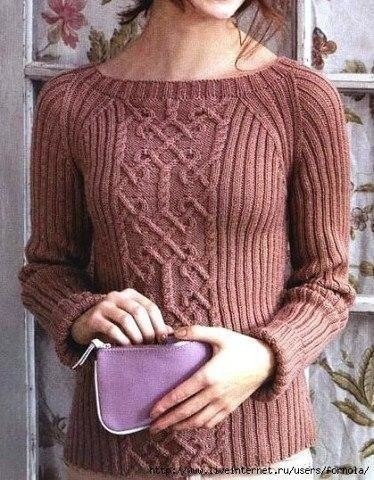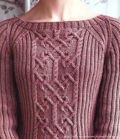 Пуловер со сложными переплетениями смотрится очень эффектно и при этом уютно.