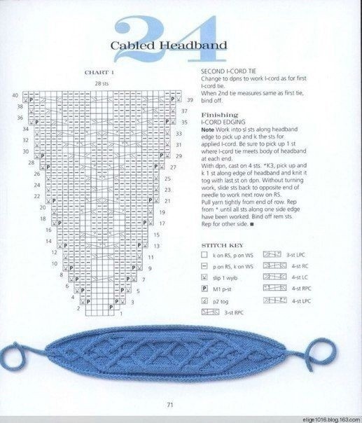 Вязаная повязка на головуВам потребуется: 100 г пряжи (65% шерсть, 35% альпака 75м/50г), спицы №4,5. Узоры: по схемам № 1, № 2, № 3. Платочная вязка: лиц. и изн. рядылиц. петл...