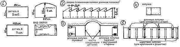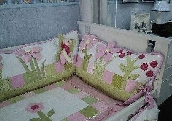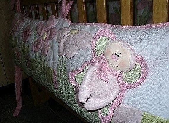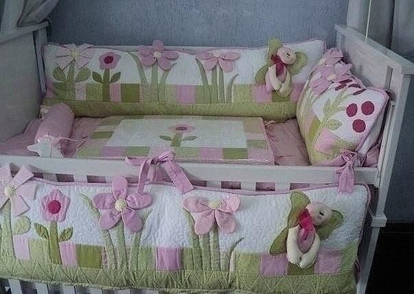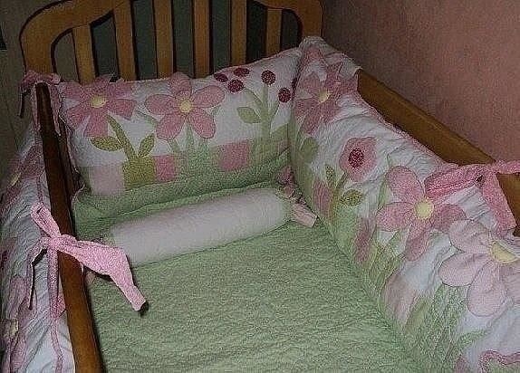 4) липучки, пуговицы, нитки. Разметить на выкройках бортиков места липучек в соответствии с конструкцией кроватки. Сложить каждый прямоугольник пополам вдоль длинной стороны, прострочить с двух сторон, вывернуть, отгладить. На застежку пристрочить мягкую половинку липучки. На бортик пришить колючие половинки липучек. Подвернуть четвертую не зашитую сторону застежки и пришить по этой стороне к бортикам.