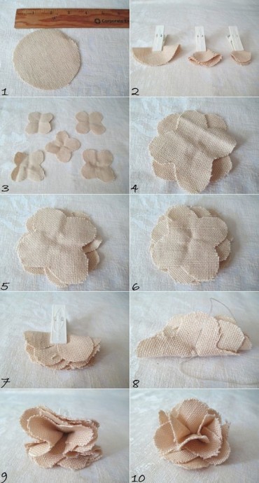 Чтобы сделать цветок из мешковины, вам понадобятся небольшие кусочки ткани различных цветов и текстур, ножницы, клей и круглая форма для вырезания.