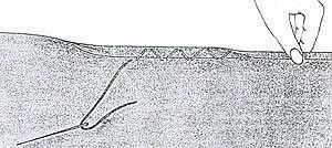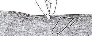 Второй способ: можно закрутить подгибку между указательным и большим пальцами и подшить полученный рулик потайным швом. Подгибку с подкруткой выполнить легче, если при этом ее натягивать. Край подгибки можно натянуть, держа его между коленями или приколов к брюкам.