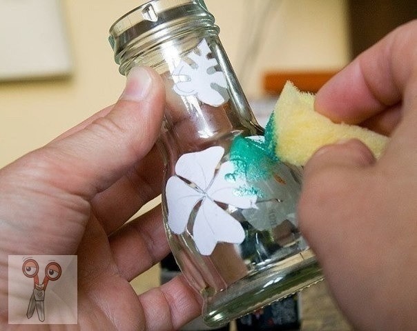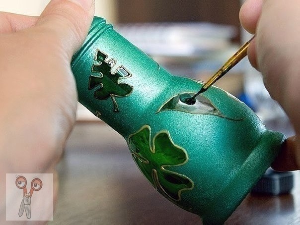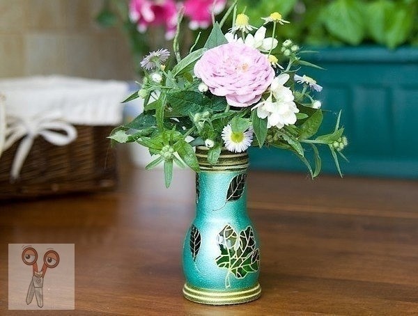 Расписная ваза для цветов создается из стеклянной бутылки причудливой формы.