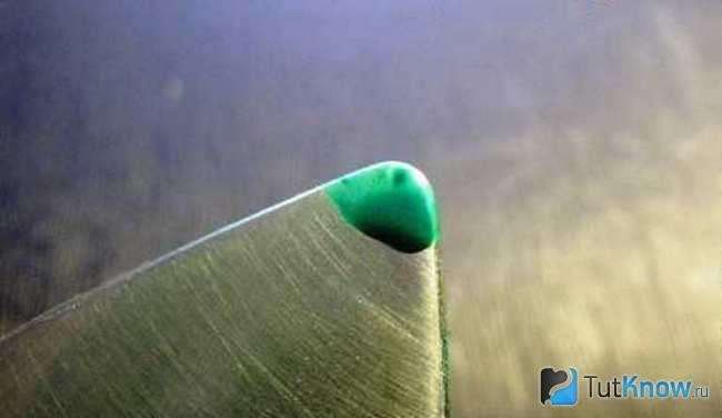Держите утюг в правой руке, а в левую возьмите зелёный мелок. Прислоните его кончик к утюгу, чтобы воск слегка оплавился.