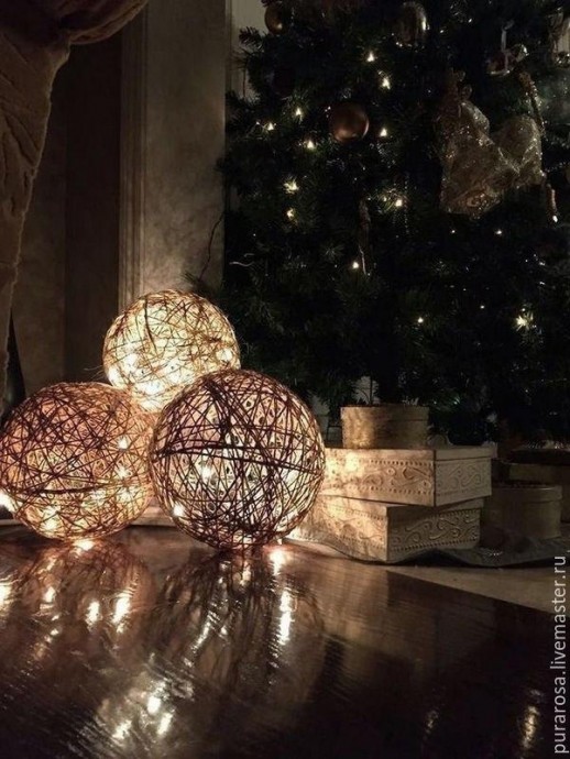 Декоративные шарики творятся из джутовой бечевки, скрепленной клеем.