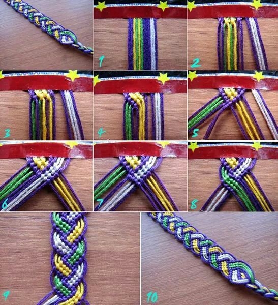 Плетение фенечекФенечки плетут из ярких нитей мулине, вощёного шнура или тонкой пряжи. Нити фиксируют на поверхности с помощью булавки или скотча и плетут узелками: прямыми, обратн...