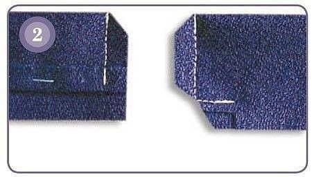 2. Сложите пояс по центральной линии сгиба, сколите. Застрочите на одном конце пояса торец до линии подгибки. На другом конце прострочите торец, разверните ткань, подняв лапку и не вынимая иглы, и вновь прострочите заход края. Обрежьте уголки, как показано на фото. Прогладьте швы.