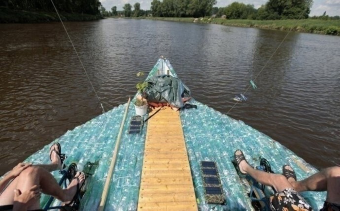 4. Наиболее простая в изготовлении конструкция – это плот. Изготавливается он следующим образом. Сначала соединяются между собой поплавки с помощью поперечин из дерева или пластиковой трубы. Они приматываются проволокой малого диаметра, чтобы не утяжелять лодку. После этого на конструкцию укладывается лист пластика или фанеры, которая так же крепится к поперечинам. Очень интересные лодки из пластиковых бутылок получаются в виде каноэ. Можно придумать свою собственную конструкцию, главное, не забывать о ее безопасности и надежности.