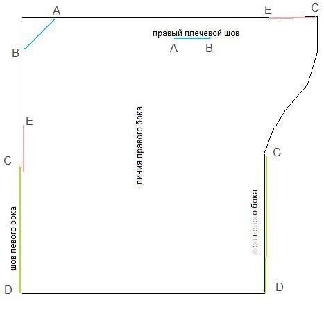 Отрезок АВ со стороны переда накладывается изнаночной стороной на лицевую сторону отрезка АВ со стороны спинки (треугольник уходит к середине переда) и настрачивается. После этого полоса выше линии АВ отворачивается вниз. Дальше единым швом соединяются ЕСD.