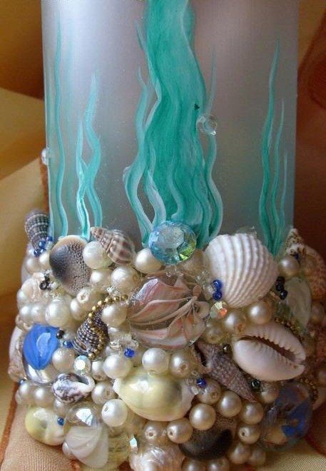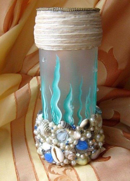 2 Затем нижнюю часть, обклеенную бичевкой, закрыла ракушками, стеклянными камушками, жемчугом, бисером, стразами (тоже на горячий клей). Получилось "морское дно".
