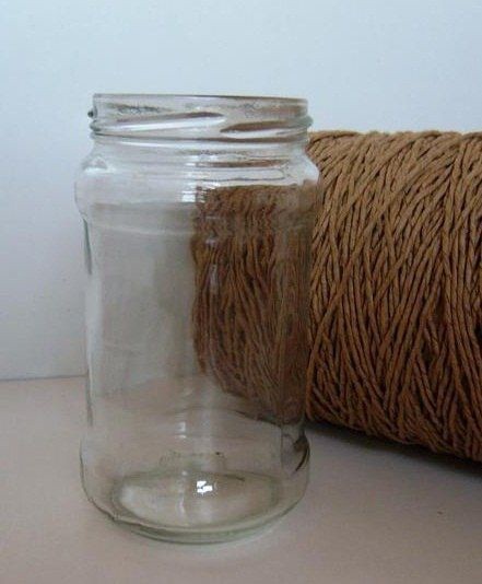 1 Стеклянную банку сверху и снизу по выпуклым частям обклеила бумажной бичевкой (на горячий клей). Можно было обойтись и без этого, просто задумка сначала была другая.