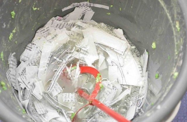 Подойдут старые газеты, макулатура, ненужные черновики. Можно пустить в ход целые листы, но лучше все-таки нарезать их помельче. Только убедитесь, что среди бумаги не затерялись скрепки или остатки клея. Эти компоненты могут повредить результату. Помещаем нарезанную бумагу в ведро и заливаем водой. Вода при этом должна быть едва теплой.