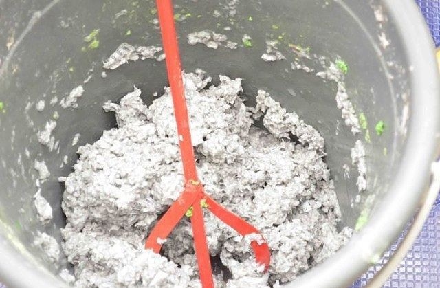 Смесь должна простоять не меньше трех часов. Тогда бумага полностью размокнет. Теперь нужно тщательно измельчить и перемешать обрезки. Можно это сделать строительным миксером.