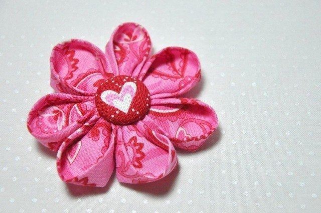 Цветок-канзаши одинаково красив и из цветной набивной ткани, и из атласных лент.