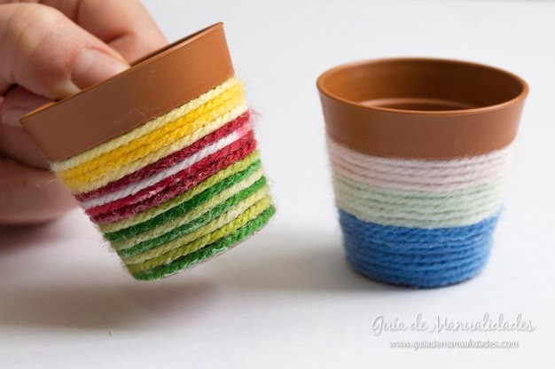 Декорируйте горшочки остатками пряжи - экономично и красиво.