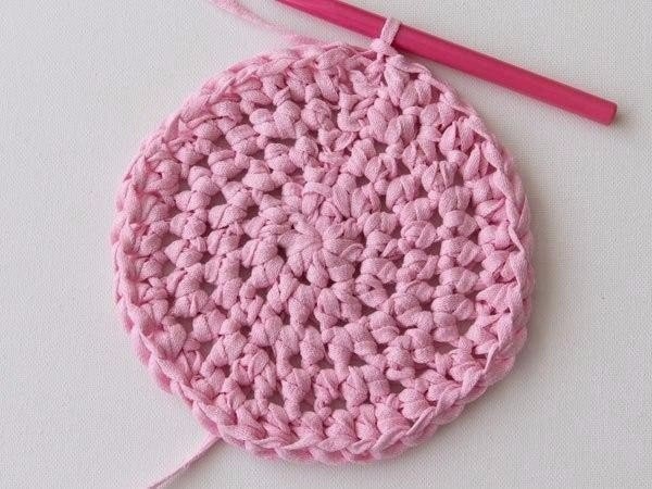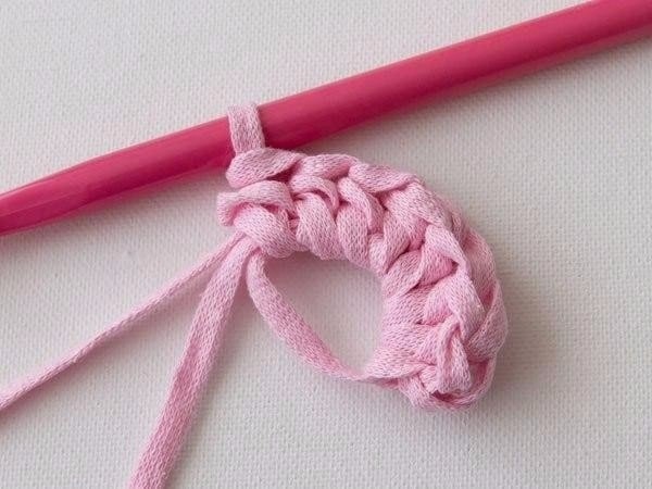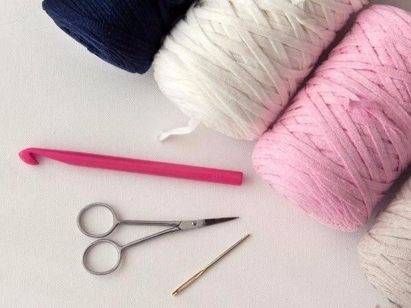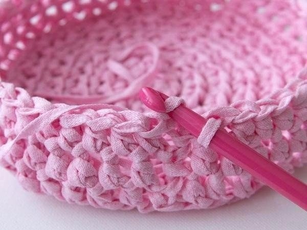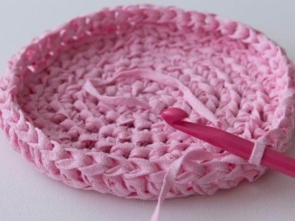 Вяжем крючком корзинку из трикотажной пряжиВ дальнейшем ее можно использовать для хранения мелких вещей.