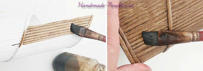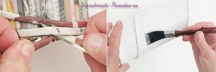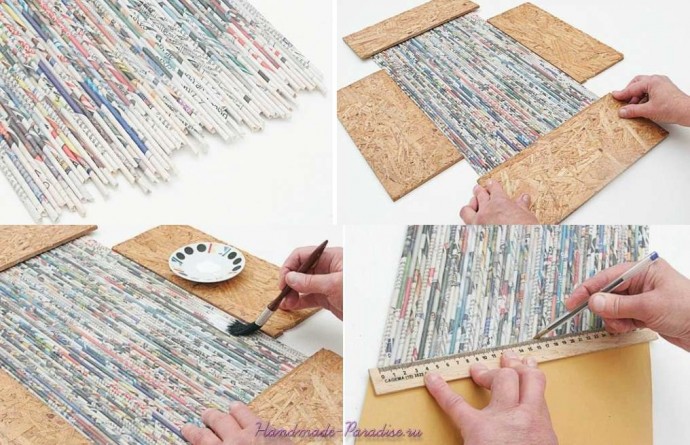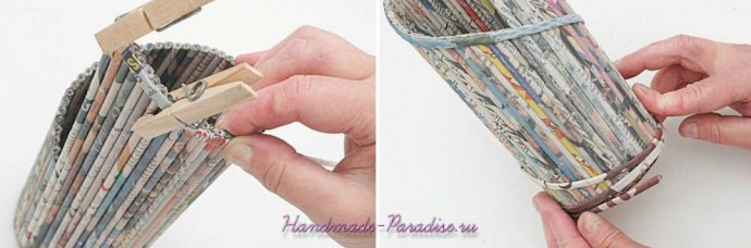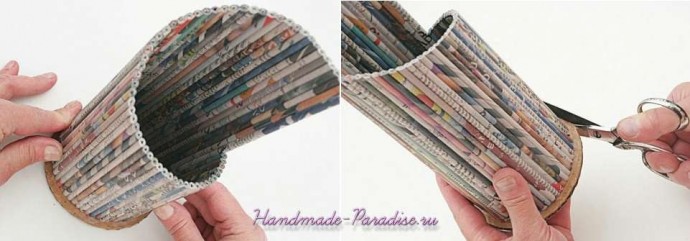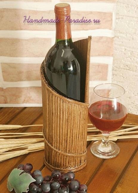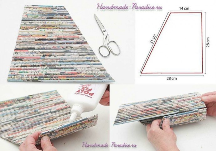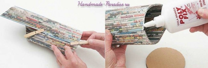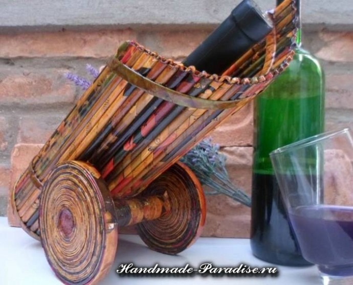 Разворот газеты — одну страницу нарезаем на 4 части. Из полученных полосок накручиваем трубочки на шашлычную палочку. При правильном кручении один конец трубочки должен получить шире или уже другого. После того, как накрутим несколько трубочек, складываем их рядышком в одно общее полотно. Сверху по полотну из трубочек проходим кисточкой клеем ПВА, чтобы зафиксировать нашу бумажную конструкцию. После высыхания заготовку вырезаем по шаблону для подставки. Размеры ниже рассчитаны для винной бутылки стандартного размера. Склеиваем края заготовки из газетных трубочек клеем ПВА. Фиксируем прищепками до полного высыхания подставки. Из картона вырезаем кружок и приклеиваем к донышку подставки. Декорируем трубочками из газет или журналов подставку, как показано на фото ниже. Оставшийся конец трубочки прячем и подклеиваем. Красим подставку белой акриловой краской, чтобы закрасить буквы (если вы трубочки крутили из газет или журналов). После высыхания белой краски покрываем подставку цветным лаком для дерева. Понадобится два слоя лака. Если вы крутили трубочки из глянцевых журнальных страниц, можете не использовать краску, а просто покрыть подставку лаком. При желании можете добавить колеса к подставке.