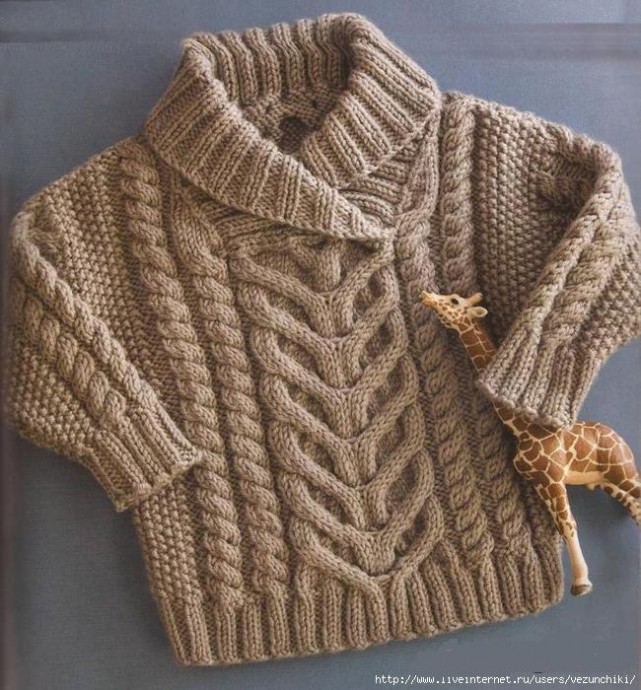 Воротник: с лиц. стороны на круговые спицы набрать 28 (32) п., равномерно распределив их вдоль края горловины правой полочки, привязать 46 (50) лиц. п. из дополнительной спицы (от спинки), набрать 28 (32) п., равномерно распределив их вдоль края горловины левой полочки Получится 102 (114) п., вязать рез. 2*2 - 9 (10) см. Закрыть петли. Пришить краи двух сторон воротника к центральным 30 (34)п. переда: правый край воротника над левым – для девочек; левый край воротника над правым – для мальчиков. Выполнить швы сторон и рукавов.