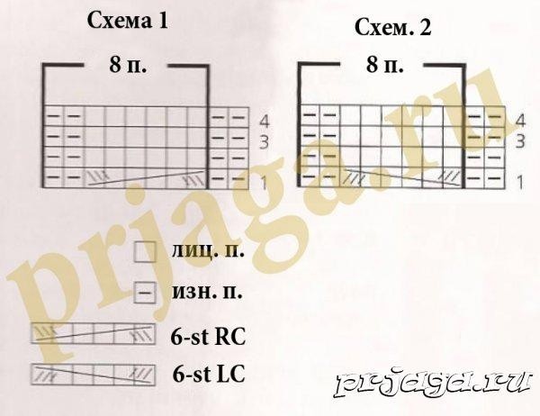 Рукав: с лиц. стороны изделия вдоль пройм спинки и переда равномерно распределить 62 (70) п. Вязать жемч. уз. первые 18 (22) п., поместить маркер, 2 лиц. (6 изн., 2 лиц.) – 3 раза, поместить маркер, вязать жемч. уз. последние 18 (22) п. След. ряд: вязать жемч. уз. первые 18 (22) п., схема 1, вязать раппорт (8 п.) схемы 2 – 2 раза, вязать жемч. уз. последние 18 (22) п. Продолжать таким образом (на рукаве должно получится 3 косы) Одновременно через 5 см. от начала начинаем убавления по 1 п. с каждой стороны в каждом 4-м ряду 9 (11) раз. Получится: 42 (46) п. Вязать ровно в длину 16,5 (20,5) см., убавить 8 п., равномерно распределив их вдоль последнего ряда Получится 34 (38) п. Перейти на спицы 3,5, вязать рез. 2*2 - 4 см., закрыть петли Для второго рукава использовать схему 3