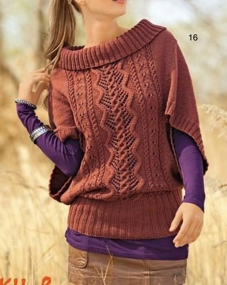 Пуловер-пончо с рельефным узором можно носить как на голое тело, так и сверху блузок.