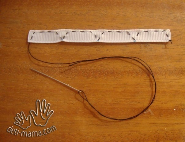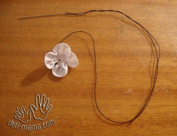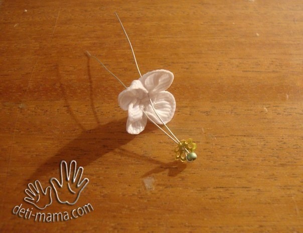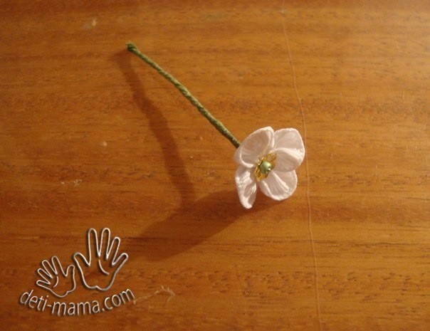 Цветок из лентЦветок из лент дополнен бусинами из искусственного жемчуга.