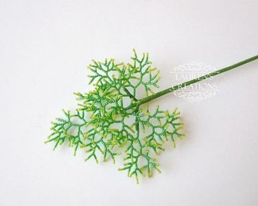 Веточка мимозы из бисераЕсли готовую веточку упаковать в желтую органзу или другой полупрозрачный материал, то получится очень эффектно.