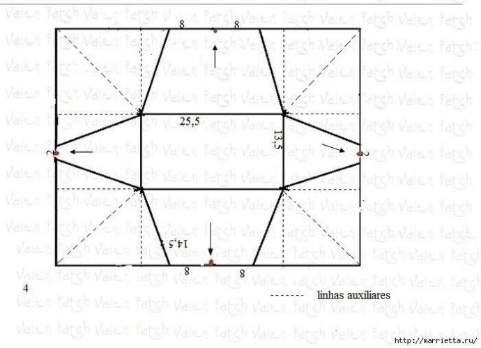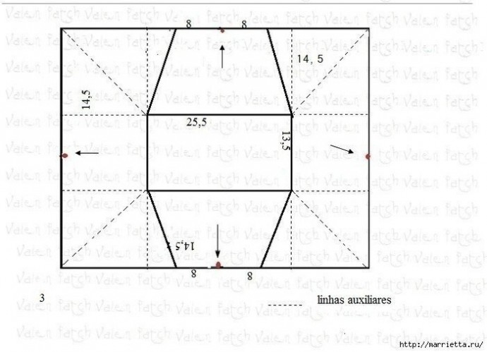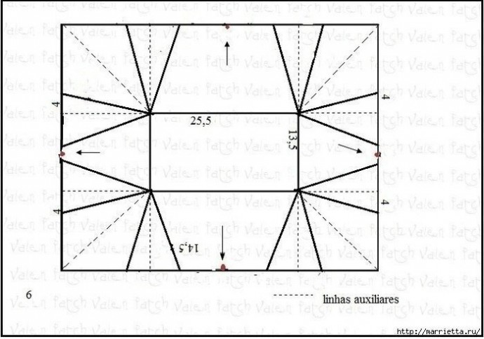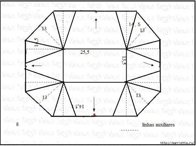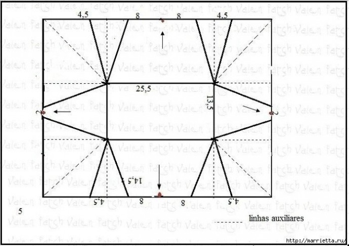 Переносим выкройку на ткань. Сумочка шьется из двух слоев ткани и подложки, можно использовать старое одеяло или плед. По бокам окантовывается, пришиваются ручки (35 на 2,5 см) и пуговички с петлями, как показано на фото.