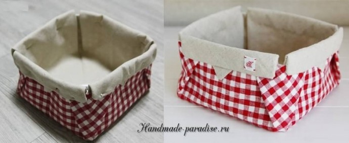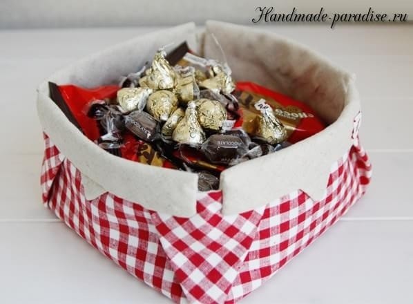 12. Вот и готова наша корзинка из ткани в технике оригами. Можно сложить в нее мелкие предметы для рукоделия, салфетки или печенье с конфетами.